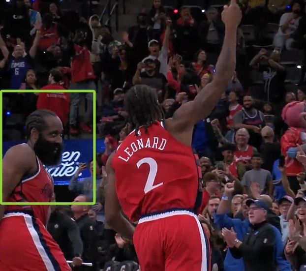 在莱昂纳德完成了最后绝杀之后,詹姆斯-哈登兴奋的跑到小卡身旁庆祝,并且露出了蜜汁表情包。