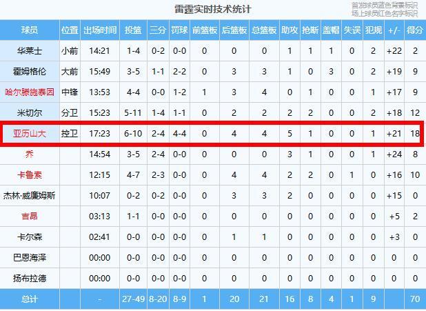 雷霆:亚历山大18分4板5助、米切尔12分2板2助2断、卡鲁索10分4板2助2断、哈尔滕施泰因9分4板、霍姆格伦9分3板1助3帽、乔8分3助、华莱士2分2助、吉昂2分、杰林·威廉姆斯3板1助、卡尔森1板